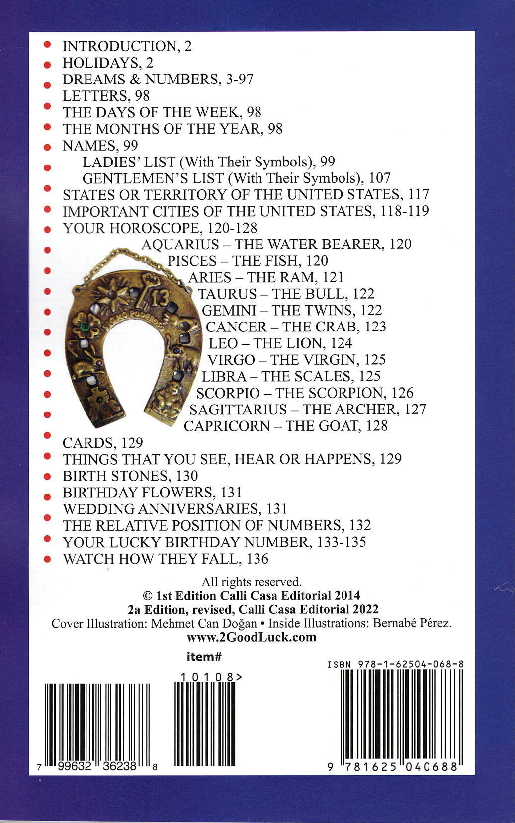 #1 selling book of Dreams & Numbers by famous Prof. De Herbert 138 Pages 8.5" x 5.5" (21 x 14cm) Contents: INTRODUCTION, 2 HOLIDAYS, 2 DREAMS & NUMBERS, 3-97 LETTERS, 98 THE DAYS OF THE WEEK, 98 THE MONTHS OF THE YEAR, 98 NAMES, 99 LADIES’ LIST (With Their Symbols), 99 GENTLEMEN’S LIST (With Their Symbols), 107 STATES OR TERRITORY OF THE UNITED STATES, 117 IMPORTANT CITIES OF THE UNITED STATES, 118-119 YOUR HOROSCOPE, 120-128 AQUARIUS – THE WATER BEARER, 120 PISCES – THE FISH, 120 ARIES – THE RAM, 121 TAURUS – THE BULL, 122 GEMINI – THE TWINS, 122 CANCER – THE CRAB, 123 LEO – THE LION, 124 VIRGO – THE VIRGIN, 125 LIBRA – THE SCALES, 125 SCORPIO – THE SCORPION, 126 SAGITTARIUS – THE ARCHER, 127 CAPRICORN – THE GOAT, 128 CARDS, 129 THINGS THAT YOU SEE, HEAR OR HAPPENS, 129 BIRTH STONES, 130 BIRTHDAY FLOWERS, 131 WEDDING ANNIVERSARIES, 131 THE RELATIVE POSITION OF NUMBERS, 132 YOUR LUCKY BIRTHDAY NUMBER, 133-135 WATCH HOW THEY FALL, 136